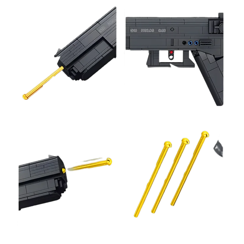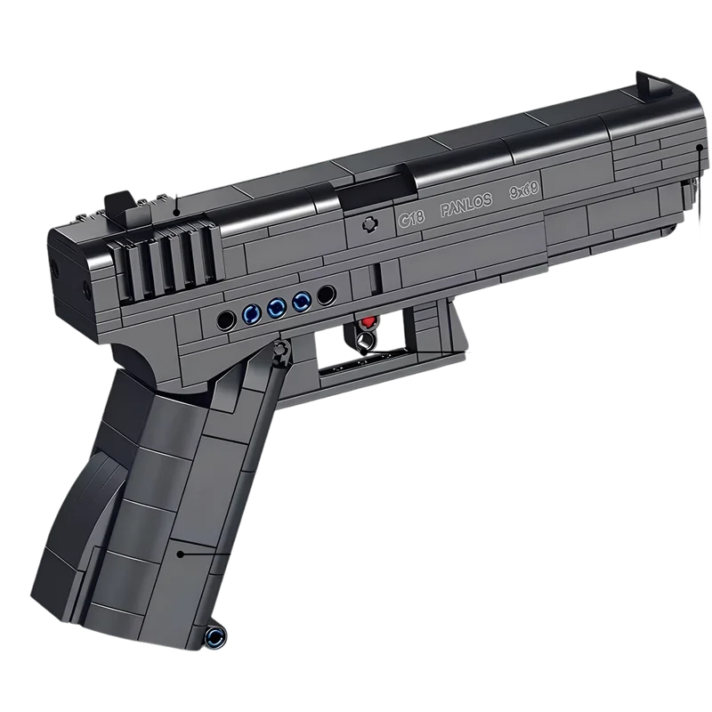 Pistol Model Kit: Build a G18-style automatic pistol with 336 pieces. Measures 9.1″ L × 5.5″ H.