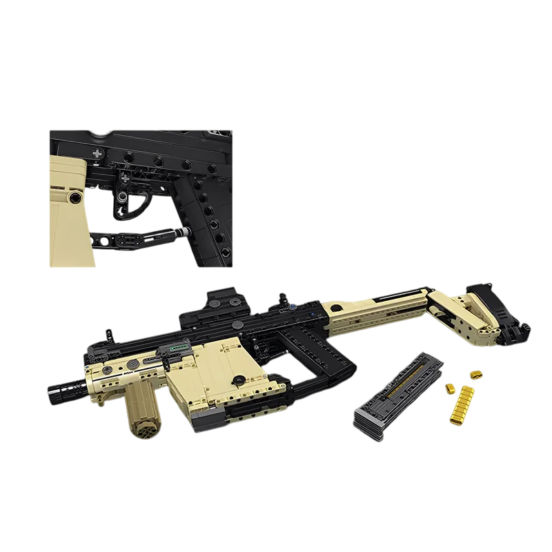 Tactical Accessories: Includes a buildable red dot scope, two removable magazines, and ten gold bullet pieces.